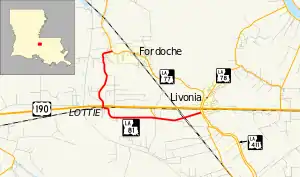 The route is L-shaped, essentially forming a loop off of LA 77. It parallels U.S. Highway 190 (US 190) from Livonia west to Lottie. It then turns north, immediately crossing US 190, and heads toward Fordoche. LA 81 is classified as a north–south route by the Louisiana Department of Transportation and Development (La DOTD), but its signage does not carry directional banners.