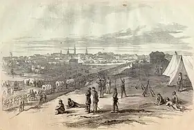 Instead of taking Louisville, Bragg left Bardstown to install Confederate Governor Richard Hawes at Frankfort. On September 26, five hundred Confederate cavalrymen rode into the area of Eighteenth and Oak, capturing fifty Union soldiers. Confederates placed pickets around Middletown on the 26th, and on the 27th their soldiers repelled Union forces from Middletown near Shelbyville Pike.[5] Southern forces reached two miles from the city, but were not numerous enough to invade it. On September 30, Confederate and Union pickets fought at Gilman's Point in St. Matthews and pushed the Confederates back through Middletown to Floyd's Fork.[6]
