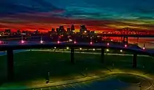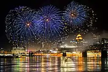 Louisville Waterfront Park is both a non-profit organization and an 85-acre (340,000 m2)[1] public park adjacent to the downtown area of Louisville, Kentucky and the Ohio River. Specifically, it is adjacent to Louisville's wharf and Riverfront Plaza/Belvedere, which are situated to the west of the park. Once a wasteland of scrap yards and abandoned industrial buildings, Waterfront Park is now a vibrant green space that welcomes over 2.2 million visitors each year. Located in the park is the Big Four Bridge which connects the city of Louisville with the City of Jeffersonville, Indiana. Waterfront Park is home to some of Louisville's most exciting celebrations, such as the Fourth of July at Waterfront Park, Forecastle Festival, WFPK Waterfront Wednesdays and Thunder Over Louisville.[1] In 2013 the park won the Rudy Bruner Award for Urban Excellence a national design award that seeks to identify and honor places that address economic and social concerns in urban design.[2]