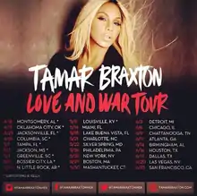 The Love and War Tour was the first headlining concert tour by American recording artist Tamar Braxton in support of her second studio album, Love and War (2013). The two-month tour started on May 16, 2014, spanning 20 shows in North America.[1]