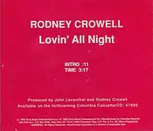 "Lovin' All Night" is a song written and recorded by American country music artist Rodney Crowell. It was released in March 1992 as the first single from his album Life Is Messy. The song peaked at number 10 on the Billboard Hot Country Singles and Tracks chart.
