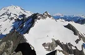 Luahna Peak is an 8,400+ ft (2,560+ m) double summit mountain located in the Glacier Peak Wilderness of the North Cascades in Washington state. The true summit is 7400+ feet in elevation, and the northwest subpeak is 8,320+ feet.[1] The mountain is situated in Chelan County, in the Wenatchee National Forest. Luahna Peak is the second highest in the Dakobed Range after Clark Mountain which is 1.04 mi (1.67 km) to the southeast, and Luahna lies 6.95 mi (11.18 km) southeast of Glacier Peak.[1] The Richardson Glacier lies to the southeast of the summit, with the Pilz Glacier and Butterfly Glacier stretching across the northern slope. Precipitation runoff from the peak drains into the White River and Napeequa River, both tributaries of the Wenatchee River.