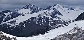 Luahna Peak from High Pass. True summit and Pilz Glacier on left; Luahna's northwest summit (aka "Chalangin Peak") and Butterfly Glacier on right