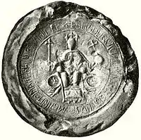 Lucas became a member of the internal opposition which rejected Béla's reign.[77] The archbishop allied with his former opponent Queen Euphrosyne and supported the aspirations of the late Géza II's youngest son, Géza,[25] who aimed to continue the anti-Byzantine and pro-papal (at least, since 1169) policies of Stephen III.[73] Around the same time, Lucas lifted Euphrosyne from papal anathema unilaterally, which was imposed on her after she had allegedly confiscated the provostship of Székesfehérvár from its provost, Gregory.[78] To avoid a possible civil war, Béla III imprisoned Géza (who had already contacted Emperor Frederick) soon after his coronation. Archbishop Lucas fell out of favour with Béla and was ignored by him in the first years of his reign. Instead of Lucas, the Archbishop of Kalocsa baptised Béla's first-born son, Emeric, in 1174.[72] Lucas lost his political importance through total neglect[79] after his long-time rival Andrew rose to become Archbishop of Kalocsa in 1176. Andrew, as a skilled diplomat, became the de facto head of the Catholic Church in Hungary and was acknowledged by Pope Alexander III.[77][80] Lucas did not appear in witness lists of the subsequent royal charters for the next eight years until 1180.[77][81] However, administering sacraments to members of the royal family had always been the Archbishops of Esztergom's responsibility. By 1176, Béla overthrew Géza's partisans' resistance and put Euphrosyne in confinement.[79] Historian Pál Engel observed Lucas' "anxiety proved to be wholly unjustified", as Béla III governed Hungary as an independent monarch and excluded the neighboring empire's influence beyond its borders throughout his reign.[74]