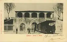 The Lucca–Ponte a Moriano line was inaugurated in 1883, with the initial southern terminus located outside the city walls at Porta Santa Maria.[7] In June 1884 the line was extended closer to the existing Lucca railway station, despite resistance from some who opposed the opening of a passage for the tram through the ancient walls of Lucca.[8] Trams were routed through the city along via dei Borghi and via dei Bacchettoni before exiting the city walls via a specially constructed[9] short tunnel subsequently called sortita Cairoli, until reaching the new terminus station of Porta San Pietro located in the square in front of the railway station.[10][11]