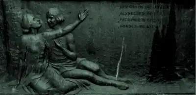 By then, Symbolist Dimitrie Paciurea had begun work on several works directly referencing Hyperion, including sketches for an Eminescu monument, leading up to his Sky Chimera;[85] Nicolae Bretan had adapted the poem into an eponymous opera, which he himself translated into Hungarian.[86] Sculptor Ion Schmidt-Faur also paid homage (to the poem rather than its protagonist) in his 1929 relief of Cătălin and Cătălina, installed at the base of his Eminescu statue in Iași.[87] During the interwar, the identification of poet and protagonist was also taken up by Lovinescu in his work as a biographical novelist: he intended to write a romanticized account, also titled Luceafărul, dealing mainly with the hero's childhood in Ipotești.[88] Mircea Eliade rendered ample homage to Luceafărul, in his novel Miss Christina, but especially so in his short story Șarpele ("The Serpent"), which relies on intertextual allusion to the point of becoming its "hierophany".[4] Andronic the aviator, a central character in the latter narrative, is a modern-day Morning Star, replicating "the fall".[89]