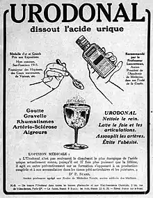 - ↑ Lefebvre, Thierry (2004). "L'Urodonal et ses publicités [Q251, L'Urodonal]". Revue d'Histoire de la Pharmacie. 92 (344): 680–684.