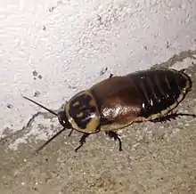 L. verrucosa grows to a length of about 4 cm (1.6 in) and is mainly black or dark brown with a white margin to the dorsal sclerites. It is sexually dimorphic, with males being slightly smaller than females and having a pair of large, usually yellow spots on the pronotum.[2] These are covered by a thin translucent cuticle and have traditionally been thought to be luminescent organs.[3] However researchers noticed that when in captivity these cockroaches were fed on carrots, the colour of the spots deepened to orange or even red. On closer examination the surface of the cuticle bears a number of small knobs each bearing a small mechanoreceptor. The upper surface of the spots is partially obscured by a pad of enlarged fat body cells which accumulate carotenoids on a diet of carrots. Insects are unable to synthesize carotenoids and the presence of orange or red spots may indicate a well-fed, fit individual. The researchers found no evidence of light emission but hypothesized that the pigmented spots may play a part in male aggression or mate choice by the female, or may provide warning signals.[4]
