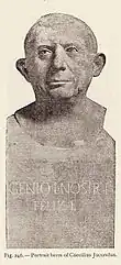 Little is known for sure about Iucundus' life.[3] He was born around the end of Augustus's reign (that is, before c. AD 14) to a freedman named Felix, who was also a banker.[7] He is likely to have entered the banking business by AD 27.[1] By AD 58 he was well-established as a successful banker who dealt with a wide variety of Pompeiians.[7] He is believed to have had offices either in the macellum or in his house, and to have worked alongside around six associates, including a freedman of the Helvii family named Apollonaris.[2]