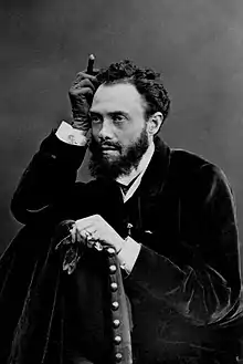 The appearance of Lepic in several works by Degas records some of the enthusiasms they had in common. These included horse racing and Degas' Gentlemen's race: Before the start (1862; Musée d'Orsay) pictures Lepic mounted among the jockeys.[7] Ballet was another enthusiasm. Lepic is shown gazing through opera glasses in The ballet from Robert le Diable (1871; Metropolitan Museum of Art, New York), one of Degas' earliest treatments of the subject,[8] and in quarter profile from behind in the Victoria & Albert Museum's larger copy (1876).[9]