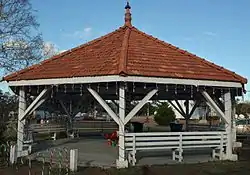 Ludowici Well Pavilion is a historic site in Ludowici, Georgia, located on McQueen Street. It was constructed in 1907 and supplied drinking water.[3] It is in an open public area in the center of town. It is shaped like an octagon and has wooden benches inside, which were originally outside. It uses locally made Ludowici tiles on the roof. With renovations in 1958 and 1983, surrounding pine trees were removed, as well as a paneled ceiling and brick floor. A steel post was added to the center for support.