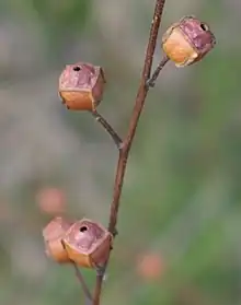Flowers are usually single, growing from the leaf axils on upper leaves. They have four yellow petals and four light green sepals.[9] The mature fruits are brown, cubic capsules with rigid sides, about 0.25 in (0.6 cm) in length.[8]