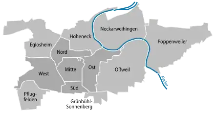 Ludwigsburg (German pronunciation: [ˈluːtvɪçsˌbʊʁk]; Swabian: Ludisburg) is a city in Baden-Württemberg, Germany, about 12 kilometres (7.5 mi) north of Stuttgart city centre, near the river Neckar. It is the largest and primary city of the Ludwigsburg district with about 94,000 inhabitants. It is situated within the Stuttgart Region, and the district is part of the administrative region (Regierungsbezirk) of Stuttgart.