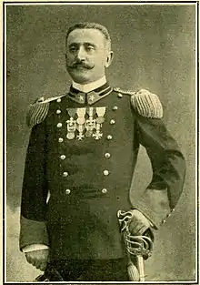 He'd lead the regiment during the Italo-Turkish War, fighting in Tripolitania and Cyrenaica. For his services in Ethiopia and Libya, he was awarded the officer of the Military Order of Savoy, the Bronze Medal of Military Valor and the Silver Medal of Military Valor. On 1914, he was promoted to major general and assumed command of the Casale Military Brigade.