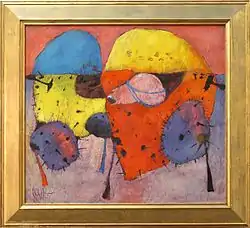 Ixquiac Xicará's art is held in the collection of the Museo Nacional de Arte Moderno "Carlos Mérida" in Guatemala City,[7] and in the collection of the Museo de Arte Contemporaneo in Panama City.[8] His paintings have been sold at auction by Bonhams in Los Angeles[9] and Clars Auction Gallery in Oakland, California.[10] He has been represented by Artique and the Galeria El Tunel, both in Guatemala City.[11][12][13][14][15] He has had solo exhibitions in diverse venues, including Casa de America Latina, Paris, France; Moscicki Center in Brussels, Belgium; and the French Cultural Center in Abidjan, Ivory Coast.[2] Museum and gallery curators have also included his art in group exhibits, among them the IV Biennial Americana de Grabado in Santiago, Chile; the Museum of Contemporary Art in Panama City, Panama; and a Contemporary Mayan Art exhibit in Norway.[2][16]