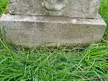 She was buried wearing her black and leopard skin finery and a pair of false eyelashes. She was also interred with one of her beloved stuffed pekinese dogs.[21] Her tombstone is a small grave marker in the shape of an urn draped in cloth with a swag of flowers to the front. The inscription on the tombstone, which misspells her "Louisa" rather than "Luisa", is inscribed with the quote, "Age cannot wither her, nor custom stale her infinite variety", from Shakespeare's Antony and Cleopatra.