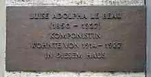 On 17 July 1927 Luise Adolpha Le Beau died at the age of 77 years in Baden-Baden. She was buried next to her parents at the city cemetery. In memory of the musician, the city of Baden-Baden has named their music library after her, and on 23 July 2004 a memorial plaque was installed at Lichtenaler Straße 46, the building in which she lived and subsequently died.