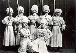 The history of Georgian horsemen in the Wild West shows began in 1892, when they first joined the Buffalo Bill’s Wild West in England.[1] After a successful European tour, Joe H. Hart was sent to recruit more riders in Georgia to appear in the Chicago World's Fair. He recruited ten riders,[2] ranging in age from 18 to 25, under the leadership of a man called Prince Ivan Makharadze. In 1893 the Gurians went to the United States, where for more than 30 years they performed under the name of Russian Cossacks in Buffalo Bill’s Wild West as well as other circuses and shows. The Gurian riders were called Cossacks for different reasons, including that Georgia was part of the Russian Empire at that time (Georgia was annexed by Imperial Russia in the 19th century and by Soviet Russia in 1921) and that the Cossacks had a colorful reputation. There is no doubt that those so-called "Cossacks" were Georgians, because almost in every case the surnames of this horsemen ended with suffixes "-dze", "-shvili", "-ia" and "-iani". These endings of Georgian surnames indicate which area of the country they originated from.