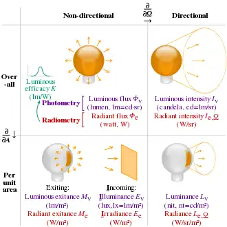 Illuminance Ev lux (= lumen per square metre) lx (= lm/m2) L−2J Luminous flux incident on a surface