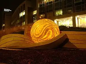 At nighttime the central sphere is illuminated by an internal light source. The glow of this light shines through the thin opaque onyx and creates the appearance of a luminary, a body or object that gives light.[2] Two large "waves" of concrete embrace the central sphere. These concrete supports are approximately 18 feet long and have a groove pattern that matches the flower beds surrounding the sculpture.