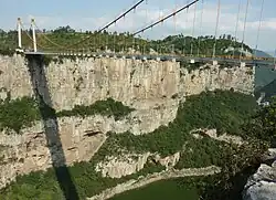 The Luojiao River Bridge is a 268 metres (879 ft) long suspension bridge in the Dafang County of Guizhou, China. The bridge forms part of China National Highway 321 between Bijie and Guiyang. As of 2012, it is among the highest bridges in the world sitting 183 metres (600 ft) above the natural river level. Three other high bridges sit along the stretch of highway between Bijie and Guiyang: the Liuguanghe Bridge, the Xixi Bridge, and the Wuxi Bridge. Construction of a dam on the river, downstream of the bridge has created a reservoir which extends under the bridge. At full pool level the clearance below the bridge is reduced to 146 metres (479 ft).