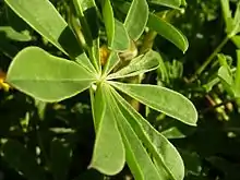 L. succulentus is a fleshy annual herb that grows up to 1 meter (3.3 ft) in height. The amount of fertility and moisture generally dictates the height of the plant. Prefers moist clay or heavy soils in full sun. Each palmate leaf is made up of 7 to 9 leaflets up to 6 centimeters long.