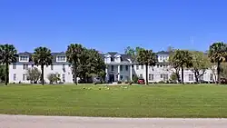 In 1904, the hotel was moved "around the corner" to its present location.[3] In the move, the original chimneys and porch were removed, and the east and west wings were added to the original central structure.[1] A new 300-ft porch was also added to the building, dubbed the "longest front porch in Texas".[1] The hotel was renamed the Hotel Palacios.[2]