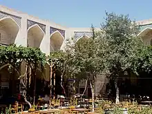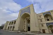 The madrasa is the oldest building of the ensemble. It has 160 cells, located in two stores on the perimeter of a two iwans yard. The traditional facades of the madrasah are adorned with majolica.[2] Over its history, the madrasa performed many different roles: it served as a caravanserai and defensive fortress, and even as a place of execution. Today a section of the madrasa is a museum dedicated to the writers Sadriddin Ayni and Jalol Ikromiy.[3]