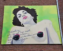 From 1978 to 1981 she was mainly concerned with performance art, from 1981 to 1988 mainly with video art.[1] She frequently appears in her videos, e.g. Romeo is bleeding (1982).[4] In 1984, her work was included in The Luminous Image, an international exhibition of video art at the Stedelijk Museum.[5] She was a member of the Time Based Arts Foundation, an organization of video artists.[6][7] Since 1988 she has focused on installations with photography, sound and video as key components.[1] Her work has been described as "a rhetorical corruption of the icons of popular culture"[8] which is at times both "shocking" and "poignantly beautiful".[9] She herself has said that her work often involves overcoming her own fears.[10]
