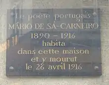 The 100th anniversary of Mário de Sá-Carneiro's death, on April 26, 2016, was highlighted in Portugal and abroad with a number of publications and events, such as the colloquium "Sá-Carneiro et les autres" (Paris), the exhibit "Mil Anos Me Separam de Amanhã" (Paredes de Coura), integrated in the festival Realizar-Poesia, an exhibit at the Biblioteca Nacional de Portugal, titled "Mário de Sá-Carneiro, 'O Homem São Louco'",[4] and a conference and audio-theatre at the Casa Fernando Pessoa.