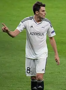 Míchel signed a two-year contract with Qarabağ of the Azerbaijan Premier League just ahead of the summer 2015 transfer deadline, and in time to be included in their Europa League squad.[27][28] He appeared regularly in his first year as Qarabağ won a third consecutive championship,[29] and scored four times in five Azerbaijan Cup ties – including a goal in the last minute of extra time to decide the final against Neftchi Baku – as his team completed a double.[30] He played in 40 matches in all competitions to help Qarabağ achieve another double in the 2016–17 season,[1] at the end of which his contract was extended for a further two years.[31]