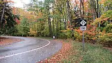 M-37 through the south side of the Grand Rapids area was realigned in late 1949 or early 1950. After the change, the highway follows Broadmoor Avenue to 28th Street and 28th Street west to its former routing along Kalamazoo Avenue.[36][37] In 1953, this routing was shifted further when M-37 was rerouted to run north on East Beltline Avenue concurrent with US 131 and M-21 to Cascade Road. There it turned west along Cascade Road and Fulton Street into downtown back to its existing alignment.[38][39] During that same time frame, the gap in the routing between M-55 and Mesick was eliminated.[40][41] The highway was moved to bypass Sparta, Kent City and Casnovia to the southwest in the 1962.[42][43] Another change around the same time frame shifted M-37's routing through Grand Rapids again. This time, M-37 was rerouted to follow M-11/M-21 along 28th Street to the US 131 freeway north to I-96 and back to Alpine Avenue.[44][45] The final Grand Rapids routing change was made in 1969 when M-37 was moved to its current course along East Beltline Avenue and I-96.[46][47] This change resulted in a concurrency with the southernmost end of M-44 that was later removed in 1977 when M-44 was truncated northward.[48][49] A proposed new routing near Comstock Park in the 1970s would have removed M-37 from Alpine Avenue. The new highway, if built, would have run southeastward from the Alpine Avenue split to US 131 near 6 Mile Road.[50] In 2008, the northernmost 18 miles (29 km) on the Old Mission Peninsula were designated what is now a Pure Michigan Scenic Byway by MDOT.[7] In 2013, the hairpin curve on a hill north of Mesick was straightened and the hill slightly leveled.[51]