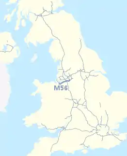 The M56 motorway serves the Cheshire and Greater Manchester areas of England. It runs east to west from junction 4 of the M60 at Gatley, south of Manchester, to Dunkirk, approximately four miles (six kilometres) north of Chester. With a length of 33.3 miles (53.6 km), it connects North Wales and the Wirral peninsula with much of the rest of North West England, serves business and commuter traffic heading towards Manchester, particularly that from the wider Cheshire area, and provides the main road access to Manchester Airport from the national motorway network.[1]