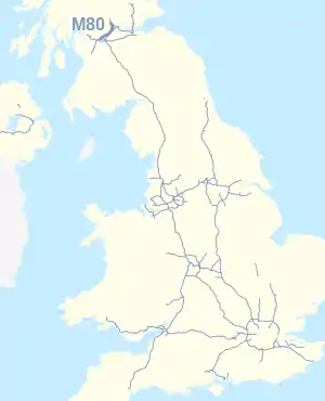 The M80 is a motorway in Scotland's central belt, running between Glasgow and Stirling via Cumbernauld and Denny and linking the M8, M73 and M9 motorways. Following completion in 2011, the motorway is 25 miles (40 km) long. Despite being only a two lane motorway, parts of the M80 Stepps Bypass are used by around 60,000 vehicles per day.[1]