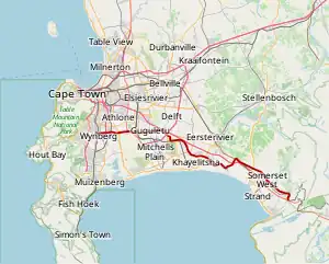 The M9 is a long metropolitan route in the City of Cape Town, South Africa.[2][3] It connects Sir Lowry's Pass Village with Wynberg via Somerset West, Firgrove, Macassar, Khayelitsha and Nyanga.[4][5]