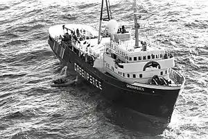Whilst participating in protests against the US testing of Trident missiles in 1989, the Greenpeace was rammed by the US Navy vessel, the USS Kittiwake (ASR-13) multiple times.[3] In late 1993 crew aboard the ship exposed Russian ships dumping 900 tonnes of liquid radioactive waste into the Sea of Japan.[4] Protests against the resumption of French nuclear testing in French Polynesia followed in 1995. During this time the vessel was boarded and detained by French police in international waters.[5]