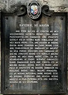 Early records indicate that Maasin is one of the oldest towns in Southern Leyte. When the Spanish missionaries arrived there, they found the native population to be relatively organized, friendly and interested in the Catholic faith.[2] The Jesuits were the first order to formally establish a parish in the community in the 1700s. A piece of stone from a destroyed convent bearing the inscription "Pa. De Tagnipa - año 1776." authenticates the establishment. The ruins exist until the present time, lying between the border of Abgao and Mantahan districts.