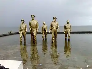 The MacArthur Landing site sits on a 6.78-hectare (16.8-acre) coastal plain in the barangay of Candahug, some 5 kilometres (3.1 mi) south of Leyte's provincial capital Tacloban.[2] It was formerly named Imelda Park after former First Lady Imelda Marcos who hails from Leyte Province.[2] The park's focal point are the seven double-life-sized bronze statues on a shallow manmade pool depicting MacArthur and his entourage during the historic A-Day Landing as captured in the iconic photo by Gaetano Faillace. They were President-in-exile Sergio Osmeña, Lieutenant General Richard Sutherland, Brigadier General Carlos P. Romulo, Major General Courtney Whitney, Sergeant Francisco Salveron, aide and orderly to Gen. MacArthur, and CBS Radio correspondent William J. Dunn.[3][4][lower-alpha 1] Designed by sculptor Anastacio Caedo and inaugurated during the 37th anniversary of A-Day in 1981, the statues mark the spot where MacArthur fulfilled his promise of "I shall return" at Red Beach, so-called for the codename assigned by the US Sixth Army to the stretch of beach from Marasbaras to Palo that was designated as one of the landing areas.[10][11] In front of the statues, two historical markers in English and Filipino can be found explaining the significance of the scene being depicted. A museum stands adjacent to the site which contains historic photographs and other memorabilia of General MacArthur including a copy of his speech upon landing and a bronze cast of his footprints.[12]