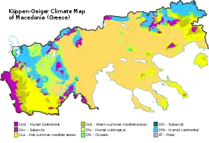 Macedonia for the most part enjoys a Mediterranean climate (Köppen: Csa). Some parts have a humid subtropical climate (Cfa), while higher elevations border a humid continental climate (Dfa). Thessaloniki has a cold semi-arid climate (BSk). The coldest winters are found in Florina, while the mildest are found in Great Lavra, which falls in hardiness zone 10a.[49]