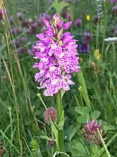 Machair is a Gaelic word meaning "fertile plain", but the word is now also used in scientific literature to describe the dune grassland unique to Western Scotland and north-west Ireland.[2] It had been used by naturalists since 1926, but the term was not adopted by scientists until the 1940s.[3] The word is used in a number of Irish, Scottish and Manx placenames to refer to low-lying fertile ground or fields, even in areas where no machair has ever been supported. [3] In Scotland, some Gaelic speakers use machair as a general term for the whole dune system, including the dune ridge, while others restrict its use to the extensive flat grasslands inland of the dune ridge.[3] In Ireland, the word has been used only in place-names, and the habitat's existence there was only recently confirmed.[3] In Manx Gaelic, 'magher' is a common term for a field.