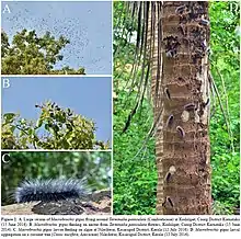 Figure 2: A. Large swarm of Macrobrochis gigas flying around Terminalia paniculata (Combretaceae) at Kodalipet, Coorg District Karnataka (15 June 2014). B. Macrobrochis gigas feeding on nectar from Terminalia paniculata flowers, Kodalipet, Coorg District Karnataka (15 June 2014). C. Macrobrochis gigas larvae feeding on algae at Nileshwar, Kasaragod District, Kerala (12 July 2016). D. Macrobrochis gigas larval aggregation on a coconut tree (Cocos nucifera, Arecaceae) Nileshwar, Kasaragod District, Kerala (12 July 2016).[1]