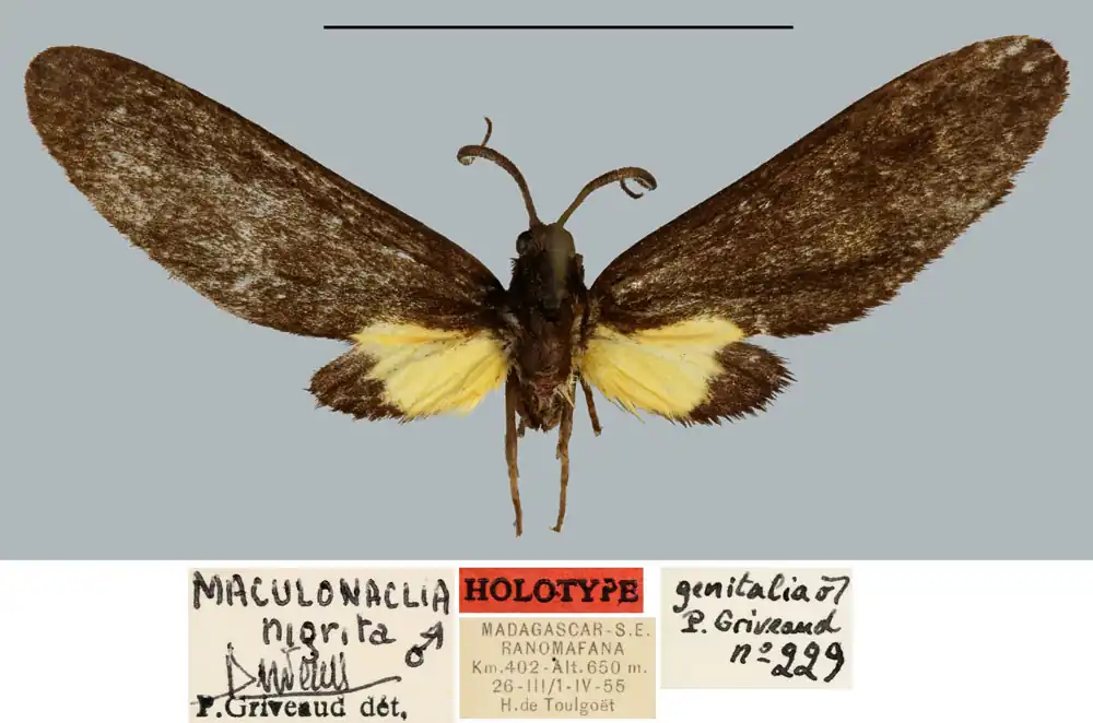 | Maculonaclia nigrita Griveaud, 1964 | |