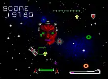 Managing to successfully destroy a group of enemies will increase the player's score five times than normal.[2] The paddle can only withstand five hits from enemy fire and it deteriorates as well if the player fails to rebound the planetoids or by crashing against enemy ships. However, if the paddle collides with a meteor, the player instantly loses a stock of their lives and once all lives are lost, the game is over, though the player has the option of continuing before the timer reaches zero and they will be mocked by the character at the continue screen depending on how long it takes to keep playing. The game will also rank the player at the high-score screen depending on how many continues were used during gameplay. After every 3000 points, an extra life is granted.[2]