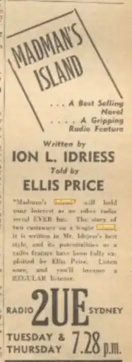 - ↑ Australasian Radio Relay League., "RADIO GETS ITS FIRST IDRIESS NOVEL "Madman's Island" To Be Read By Ellis Price Next Month", The wireless weekly : the hundred per cent Australian radio journal, Sydney: Wireless Press (Vol. 36 No. 26 (June 28, 1941)), nla.obj-715022173, retrieved 12 December 2023 – via Trove