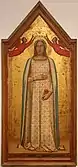 A Madonna del Parto ("Madonna of Parturition") is an iconic depiction of the Virgin Mary shown as pregnant, which was developed in Italy, mainly in Tuscany in the 14th century. Examples include works by Taddeo Gaddi, Bernardo Daddi and Nardo di Cione, but the fresco by Piero della Francesca in the Museum of Monterchi, in the province of Arezzo, is considered the most famous one. The Madonna was portrayed standing, alone, often with a closed book on her stomach, an allusion to the Incarnate Word. These works were associated with the devotions of pregnant women, praying for a safe delivery.[1] Sometimes, as with a statue by Sansovino in the Basilica of Sant'Agostino in Rome, the depiction is of a Virgin and Child, which was however known as a Madonna del Parto, because it was especially associated with devotions related to pregnancy. Here the Virgin wears the Girdle of Thomas, a belt of knotted cloth cord that was a relic held in Prato Cathedral, which many versions show her wearing.