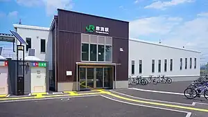 The station is unmanned and does not have an automobile parking lot, but does have a drop-off area and a waiting area for one taxi.[9][3] A simple Suica ticket gate is installed.[11]There are no automatic ticket vending machine or numbered ticket issuing machines at this station.[12] In lieu of an elevator, there is a ramp up to the platform level inside the station building. Washrooms are also available inside the station.