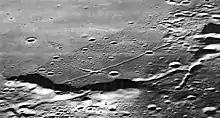 Maestlin is a small, bowl-shaped impact crater located near the eastern edge of the lunar Oceanus Procellarum. It was named after German mathematician Michael Maestlin.[1] To the east lies the crater Encke and to the northeast is Kepler. Just to the southeast of Maestlin is the curved, ridge-like remains of Maestlin R, a walled plain that has been almost completed submerged by the mare. South of this feature is a system of linear rilles named Rimae Maestlin. The mare surface around Maestlin is dusted with ray material from Kepler.