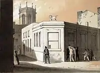The Liverpool Sailors' Home in Canning Place, c. 1860. The sailor is "paid off at the Home" and meets Maggie "cruising up and down" the square. In one version of the lyrics she is wearing a "crin-o-line", the bell-shaped dress worn by the woman in the foreground.[1]