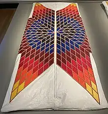 • Body Bag[15] project was inspired by Thompson's father passing away. The night he died, "watching the coroners carried him away in a simple solid-colored bag" inspired her to create a bag and give it more of a happy feeling.[5] The theme of this piece is her grievance, loss of her father as well as exploring her Native Ojibwe heritage. This piece was displayed in the Freeborn County Arts Initiative.[15] The body bag was created with black vinyl and is star quilt sewed out of vinyl including the color green, blue, red, orange, yellow, and white triangles in the center of the bag as well as wraps around the bag. This particular design is inspired by a star quilt that her mother gave her father when they married.[5] Thompson created this for her father as a form of honoring her father as well as saying goodbye. The textiles represented "the contain memory to reflect and tell a difficult story".[15]