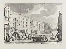 Beginning in 1423, the authority to determine the most efficient means to contain and eradicate frequent infections and to coordinate efforts between various government offices was completely delegated to the Full College, the executive committee of the Senate. However, given the numerous duties of the Full College, ad hoc commissions had to be created during the epidemics of 1459, 1460, and 1468 in order to effectively deal with the health crises.[5] Despite the need for a permanent committee of public health, there was resistance from other government offices whose own authority would be diminished, primarily on the part of the Salt Office whose tax revenues, derived from the government monopoly of the salt trade, largely financed the lazarets, used for quarantine on islands away from the city.[6] Additional resistance to empowering a permanent government office stemmed from commercial interests which would be affected by the imposition of quarantine on ships and their cargo.[7] Nevertheless, a dedicated committee, the three provveditori alla sanità, was established by the Senate on 7 January 1486 (Venetian year 1485) to defend the city from the second major outbreak of the plague. At the conclusion of its twelve-month term, the committee was not renewed, and more delays ensued until 9 January 1490 (Venetian year 1489) when the provveditori were definitively established.[8][9]